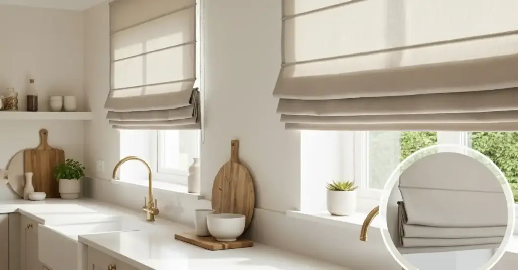 Roman blinds bring a soft, elegant look to the kitchen. They fold neatly when raised and create a smooth fabric panel when lowered.