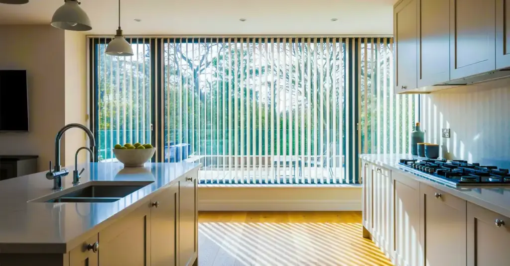 For large kitchen windows or sliding doors leading to a patio or backyard, vertical blinds are an excellent choice.