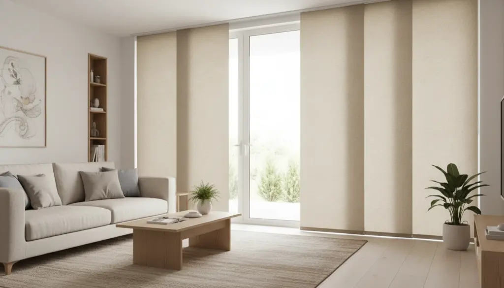Panel glide blinds are one of the best modern options for sliding and patio doors. Designed with wide fabric panels that glide smoothly along a track, they’re easy to operate, visually striking, and ideal for large glass surfaces. When open, they stack neatly to one side; when closed, they provide full coverage with elegant vertical lines.