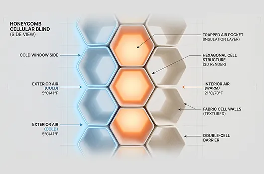 - Zero Thermal Resistance: A thin fabric or single-cell blind has a negligible “R-value” (the measure of thermal resistance). It might stop a glare, but heat passes through it via conduction almost instantly.