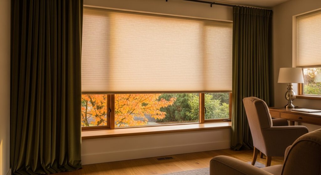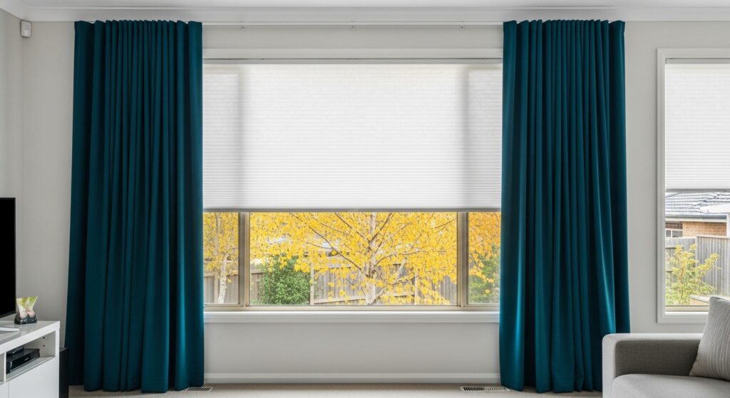 When you install a honeycomb blind inside the window frame and a heavy floor-to-ceiling curtain over the top, you create a pocket of “still” or “dead” air. This air acts as a powerful insulator because heat struggles to move through a non-moving medium.