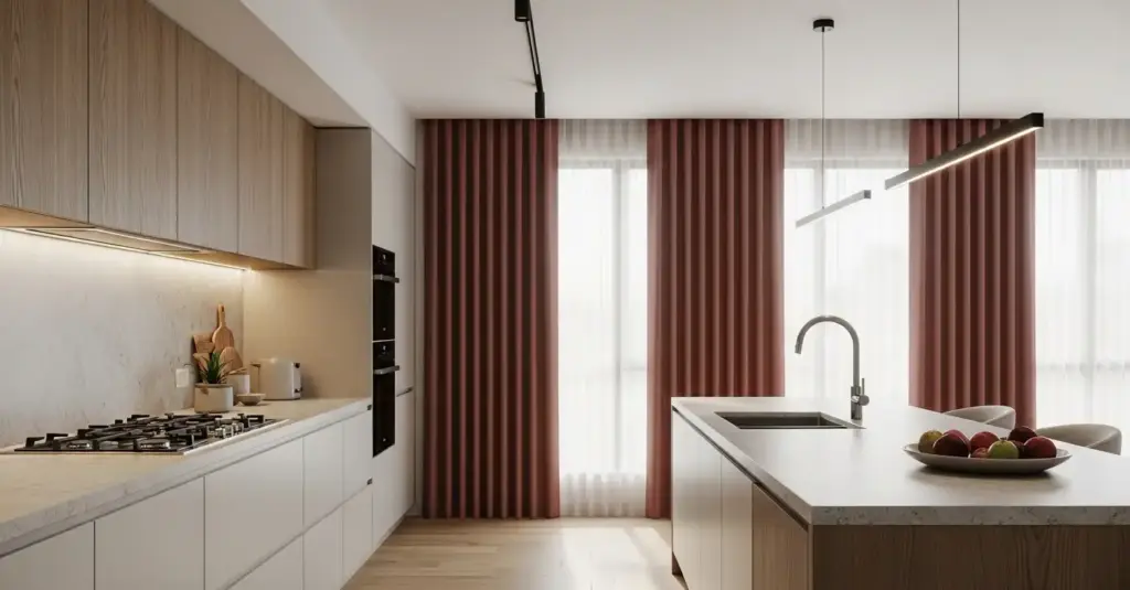 • Darker curtains create contrast and drama, especially in modern or industrial kitchens.