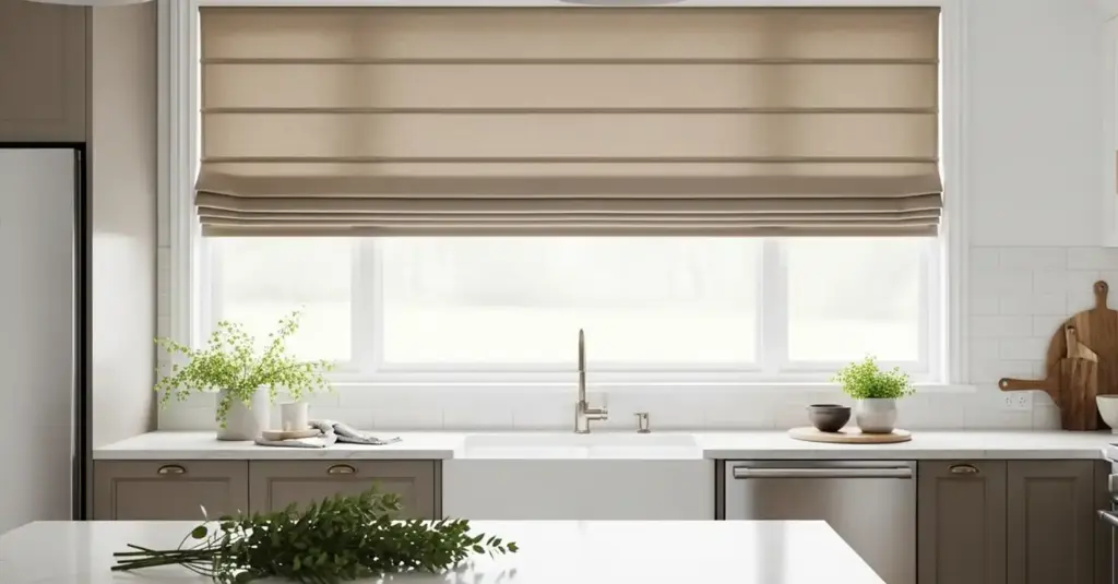 Roman blinds bring a touch of elegance to the kitchen by combining the softness and warmth of fabric with the neat, compact look of blinds. They fold up gracefully when raised, creating a clean and tailored appearance without the bulk of traditional drapes.