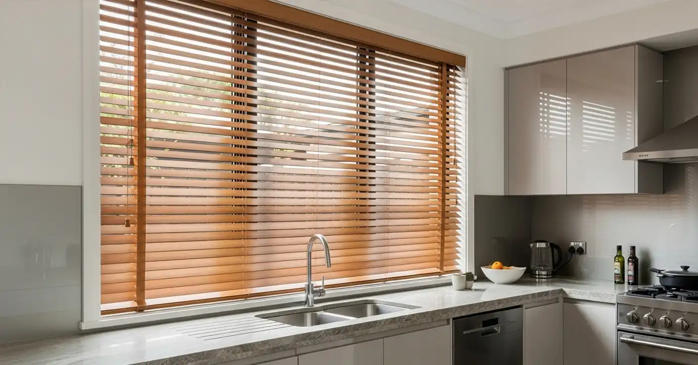 Venetian BlindsWindows near cooking zones or where privacy control is essential.Adjustable slats, easy to clean, moisture-resistant materials.