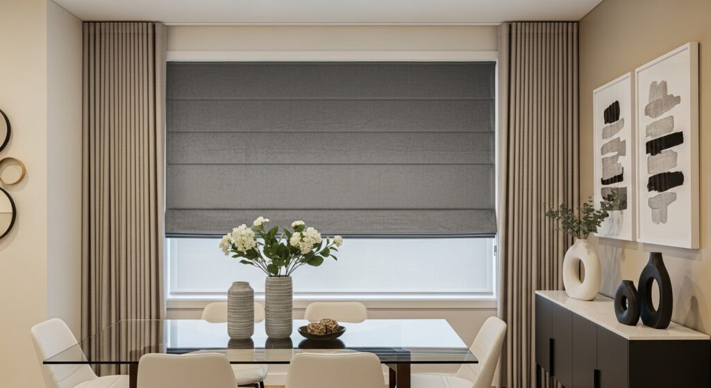 Pair Roman shades with floor-length curtains for a classic and layered window treatment that’s both elegant and practical.