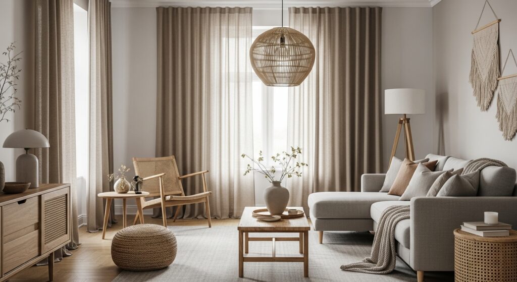 Linen curtains in natural shades like beige, white, or soft grey create a timeless, versatile backdrop.