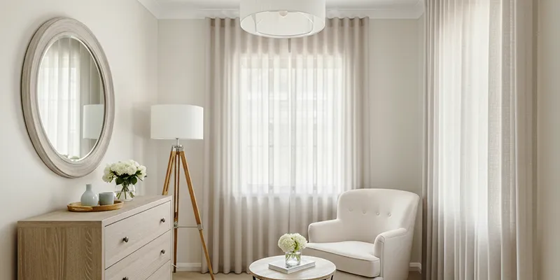 Soft, flowing textures, like linen-look curtains or light voile fabrics, add warmth without overwhelming the space.